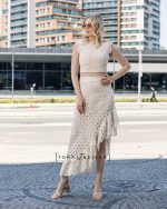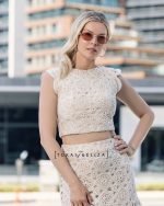 This two-piece womenโ€™s set, crafted with refined detailing and contemporary elements, offers an exceptional blend of elegance and sophistication. The cropped top is made from lace fabric featuring structured circular motifs, designed to fit comfortably while gracefully enhancing the natural silhouette. The asymmetrical skirt, with its softly curved hemline and matching lace texture, creates a harmonious and feminine flow that complements the top perfectly.