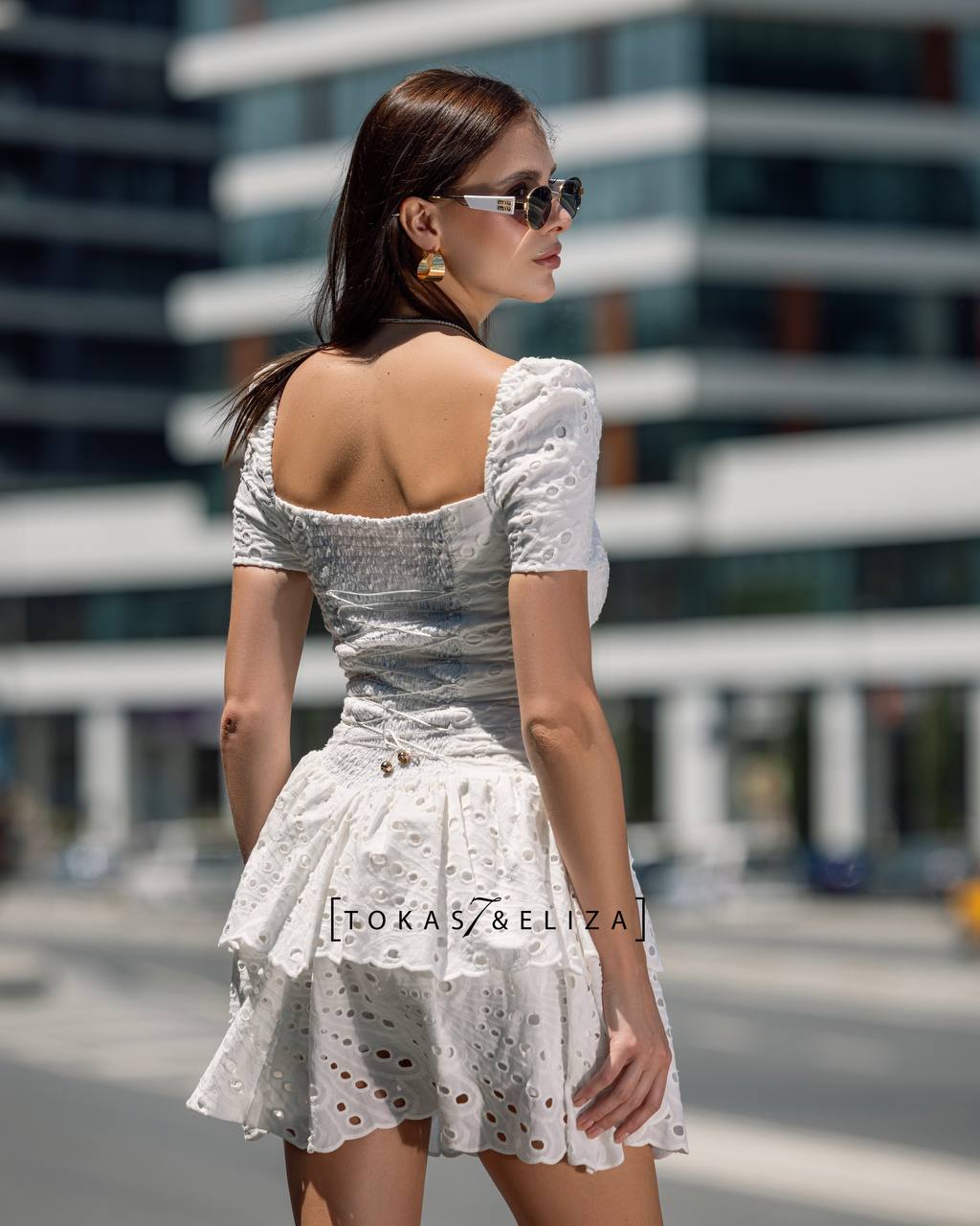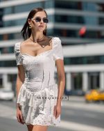 This white mini dress features an elegant silhouette and refined detailing, offering a harmonious blend of modern simplicity and intricate craftsmanship. The patterned, eyelet-embroidered fabric provides a lightweight, breathable texture while adding a delicate and distinctive visual appeal. The structured square neckline creates a timeless yet contemporary look, complemented by softly puffed short sleeves that enhance the femininity of the upper silhouette.
