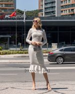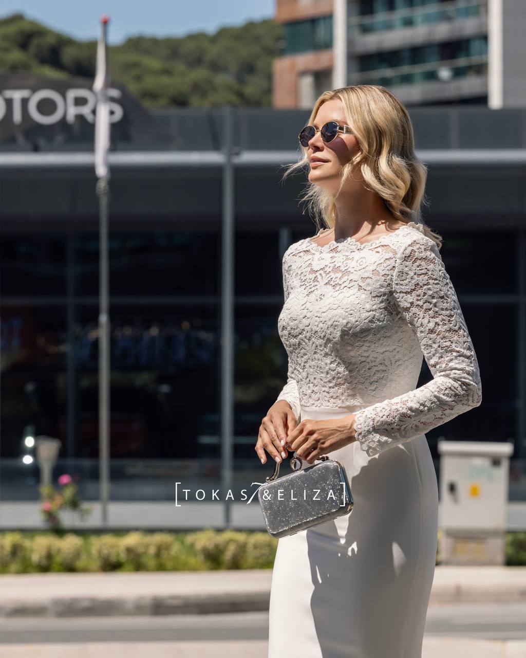 This dress features a delicate lace bodice, long sleeves, and a precisely tailored skirt, creating a refined balance of softness and elegance, making it an ideal choice for formal occasions, special events, and sophisticated minimalist styling.
