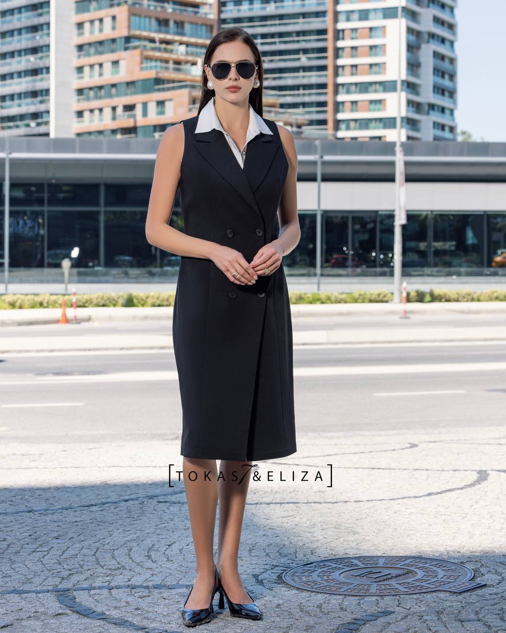 A sleeveless black dress with a classic white collar and a straight knee-length cut, designed for formal looks, stylish workwear, and semi-formal occasions with a polished, professional appearance.