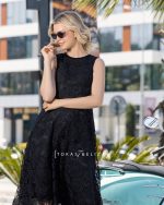 This black midi dress features a tailored bodice with a softly flared skirt, offering a refined balance between structure and movement. Crafted from a high-quality fabric with a smooth drape, it provides a polished fit that enhances the silhouette without compromising comfort.