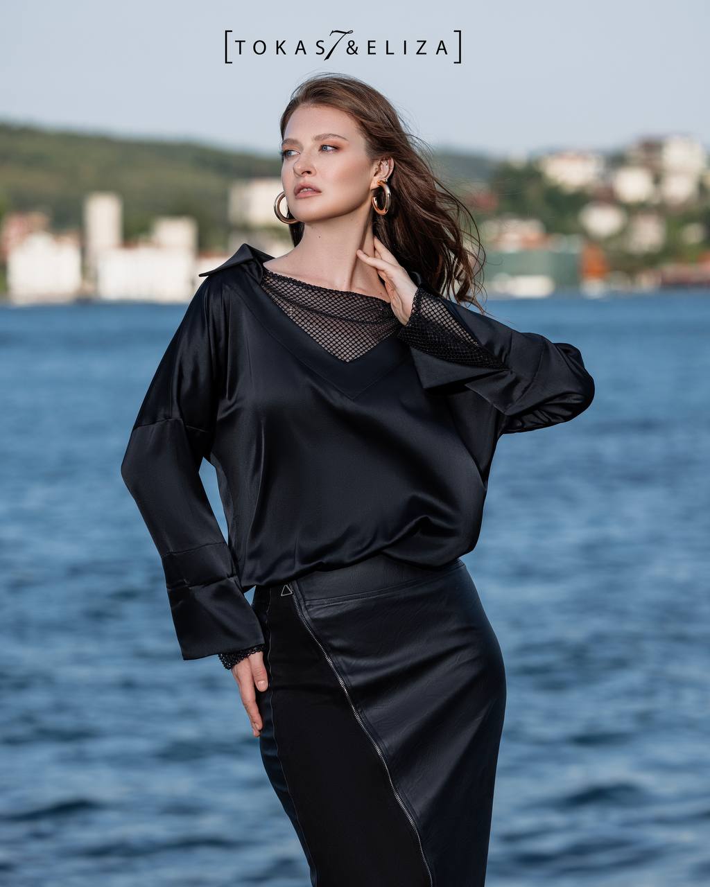 A black blouse with a minimalist design and delicate lace detail at the neckline, adding a refined and elegant touch. A perfect choice for formal and semi-formal looks, easy to style with skirts or tailored pants.