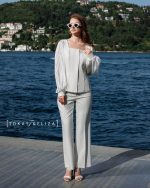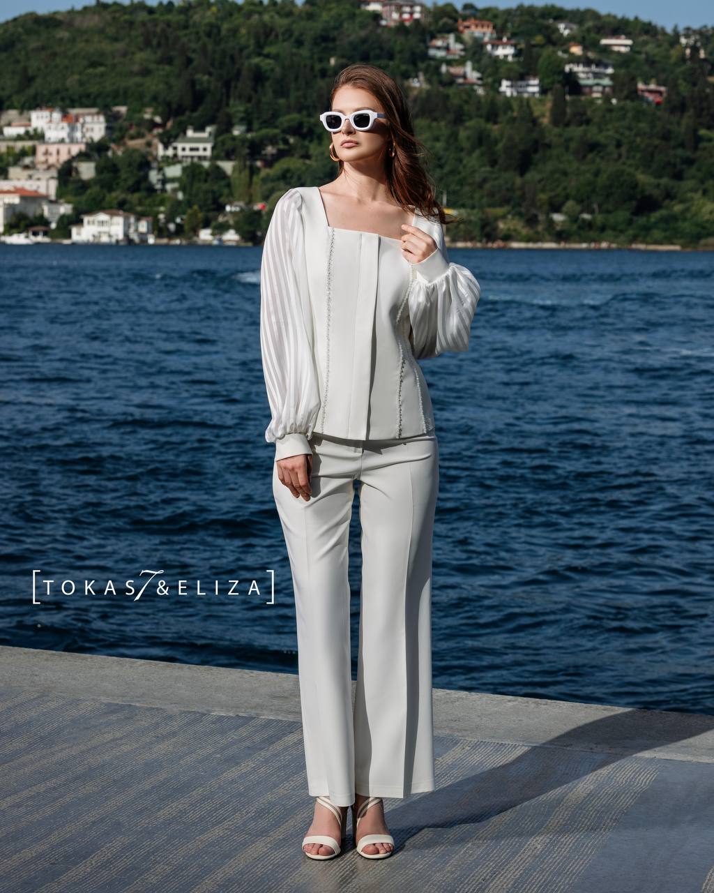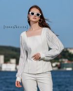 This womenโs blouse features a refined, structured design that blends modern minimalism with classic elegance. The square neckline creates a distinctive and sophisticated silhouette, while the long sleeves crafted from semi-sheer striped fabric add a sense of lightness and delicacy. Precise tailoring through the bodice enhances the overall fit, making this blouse an ideal choice for formal, semi-formal, and elevated everyday styling. A timeless piece designed for women who value detail, quality, and understated luxury.