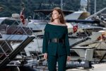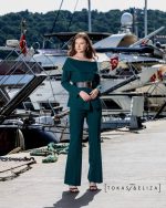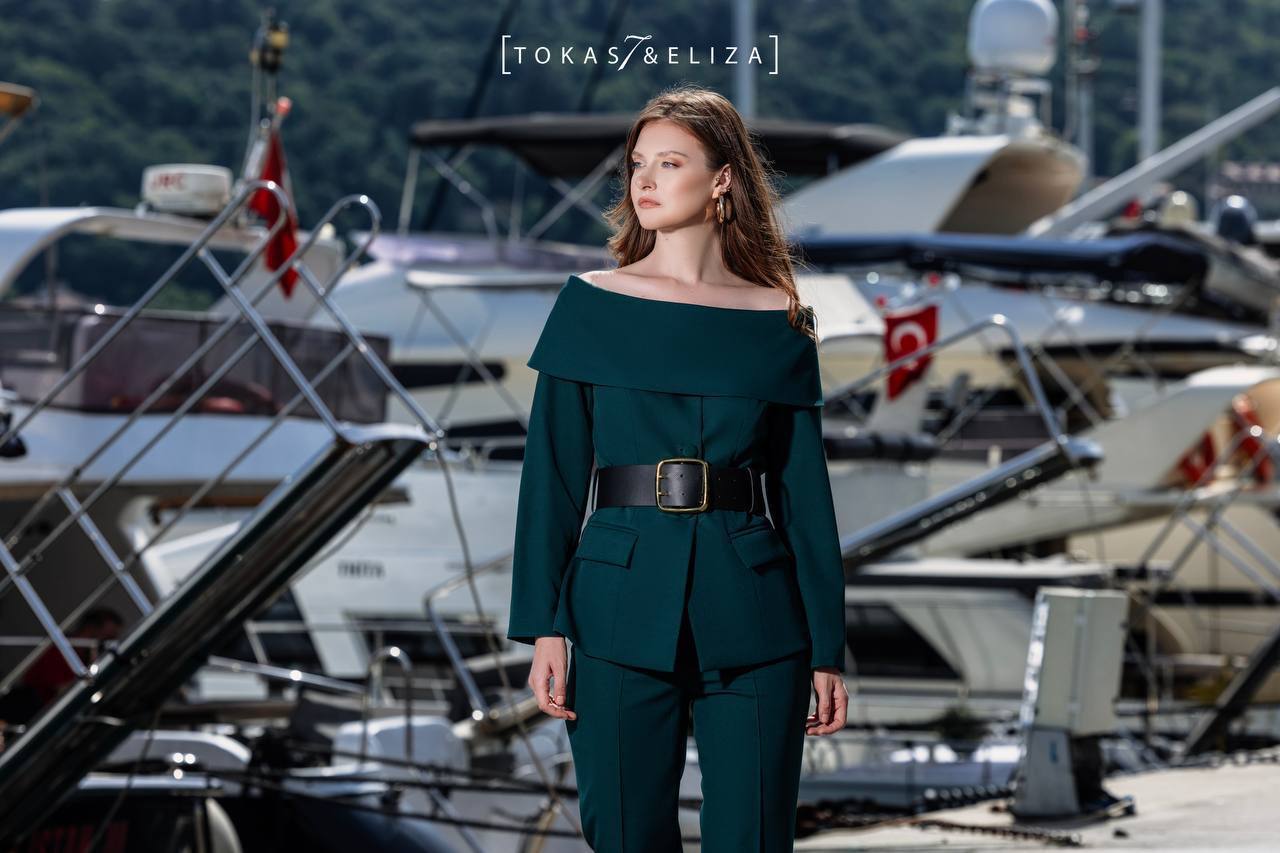 This formal set, with its structured design and precise tailoring, is a fusion of feminine elegance and strong form. The distinctive neckline and clean lines flatter the upper body, while the straight, elongated fit of the trousers creates a tall and well-balanced silhouette.