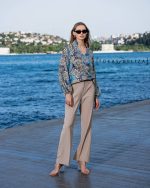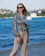 A patterned blouse featuring a blue color palette and classic motifs, offering a timeless and stylish appearance. Designed with a relaxed fit, suitable for both everyday wear and smart casual outfits.