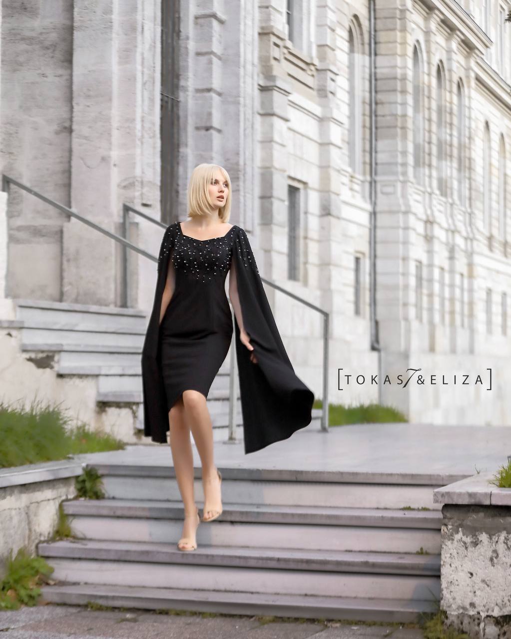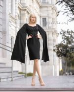 One of the most distinctive features of this design is its long, flared sleeves, which drape gracefully over the arms like a delicate cape. These sleeves create a fluid and mesmerizing silhouette with every movement, setting the dress apart from ordinary eveningwear. The overall fitted cut maintains sophistication while highlighting a feminine and refined look. The length of the dress makes it ideal for formal events, special gatherings, and evening occasions, and it pairs beautifully with both minimalist and classic accessories.