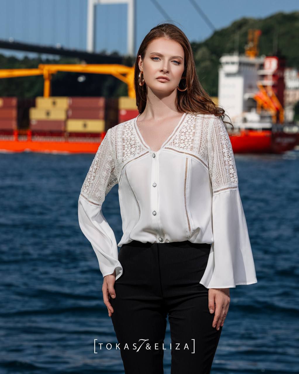 This womenโs blouse showcases a refined balance of modern elegance and feminine sophistication. Crafted from a soft, well-structured fabric and enriched with delicate lace inserts and fine stitching, it reflects a subtle sense of luxury within a minimalist design. The gentle V-neckline and gracefully shaped sleeves enhance its polished silhouette, making it an ideal choice for formal and semi-formal styling. A distinguished piece for women who value quality, detail, and a distinctive design signature.